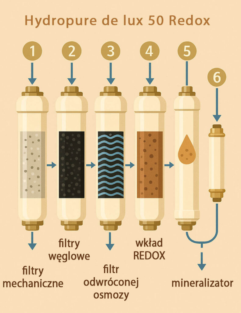 Jak działa system Hydropure DE LUXE 50 REDOX?Hydropure DE LUXE 50 REDOX to 6-stopniowy system filtracji osmotycznej, który skutecznie usuwa z wody nawet najmniejsze cząsteczki zanieczyszczeń, a następnie wzbogaca ją i rewitalizuje. Każdy etap ma swoje zadanie — od ochrony przed piaskiem i rdzą, po nadanie wodzie korzystnych właściwości antyoksydacyjnych. Efekt? |