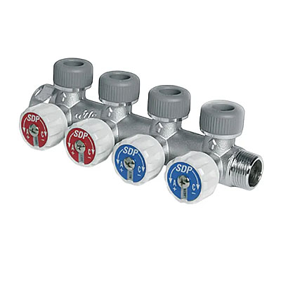 Złączka polibutylenowa. Rozdzielacz czteroportowy z zaworami 3/4″x3/4″x15x15x15x15